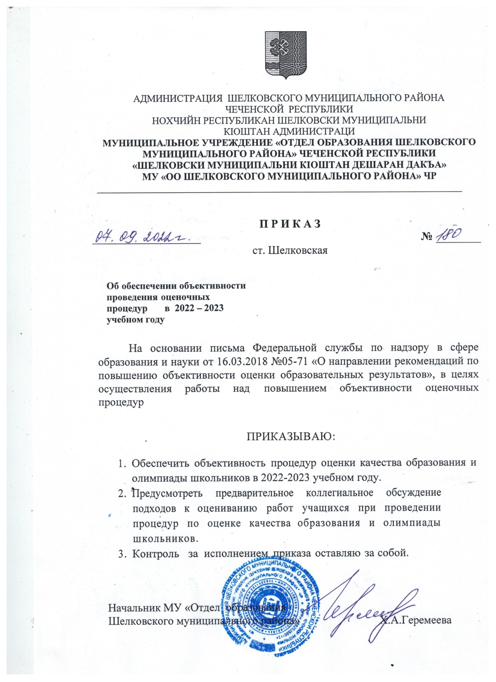 Приказ об утверждении итогов муниципального этапа Республиканской олимпиады школьников "Предметная олимпиада им. А.А.Кадырова" в 2021-2022 учебном году