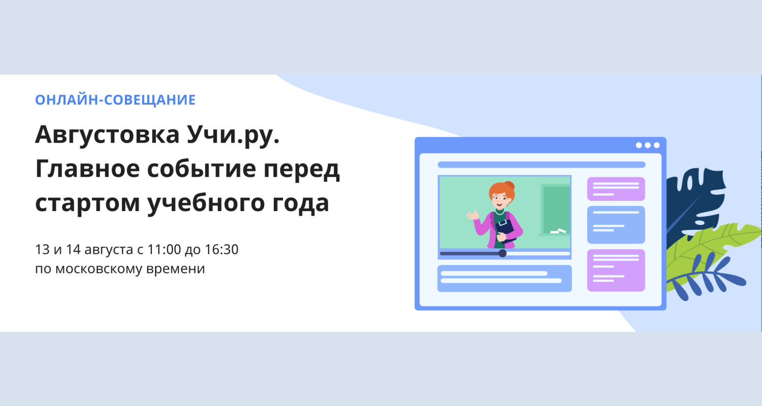 12.08.202013 и 14 августа в режиме онлайн пройдет первое открытое всероссийское совещание-конференция «Августовка Учи.ру. Главное событие перед стартом нового учебного года». На нем выступят представители Учи.ру, НИУ ВШЭ, Российского движения школьников, АНО «Россия — страна возможностей», конкурса «Учитель будущего», мастерской управления «Сенеж», центра цифрового развития «Точка роста», победители всероссийских педагогических конкурсов и многие другие.