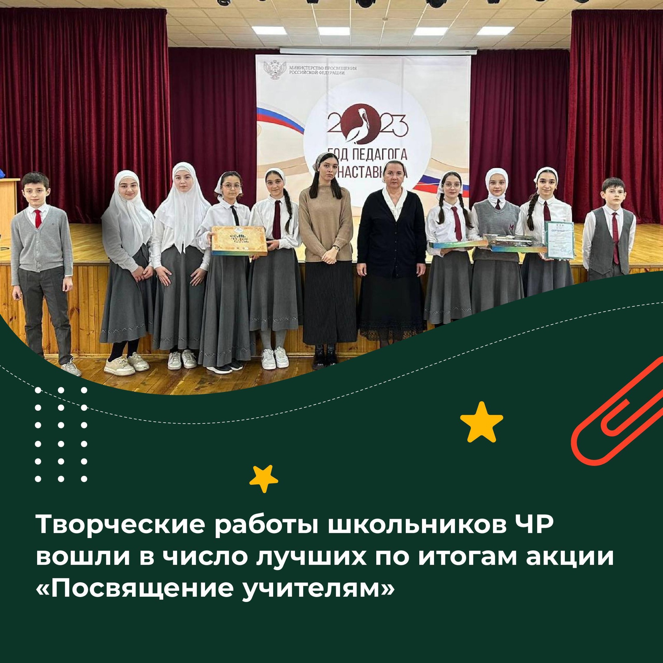 15.01.2024Подведены итоги Всероссийской акции «Посвящение учителям». Творческие работы школьников Чеченской Республики вошли в число лучших по итогам Всероссийской акции «Посвящение учителям».